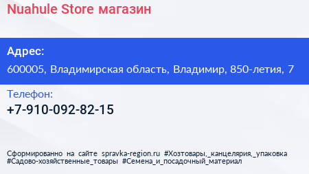 Nuahule Store, магазин по адресу 600005, Владимирская область, Владимир, 850-летия, 7 в дальнейшем Организация, размещена в следующих категориях:
