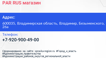 PAR-RUS, магазин по адресу 600035, Владимирская область, Владимир, Безыменского, 26а в дальнейшем Организация, размещена в следующих категориях: