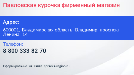 Павловская курочка, фирменный магазин по адресу 600001, Владимирская область, Владимир, проспект Ленина, 14 в дальнейшем Организация, размещена в следующих категориях: