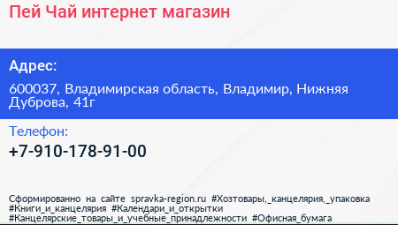 Пей Чай, интернет-магазин по адресу 600037, Владимирская область, Владимир, Нижняя Дуброва, 41г в дальнейшем Организация, размещена в следующих категориях: