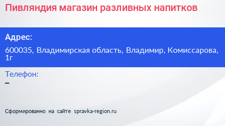 Пивляндия, магазин разливных напитков по адресу 600035, Владимирская область, Владимир, Комиссарова, 1г в дальнейшем Организация, размещена в следующих категориях: