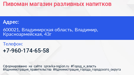 Пивоман, магазин разливных напитков по адресу 600021, Владимирская область, Владимир, Красноармейская, 43г в дальнейшем Организация, размещена в следующих категориях: