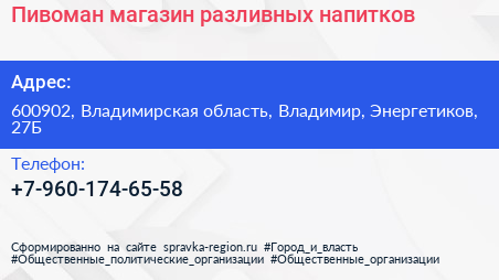 Пивоман, магазин разливных напитков по адресу 600902, Владимирская область, Владимир, Энергетиков, 27Б в дальнейшем Организация, размещена в следующих категориях: