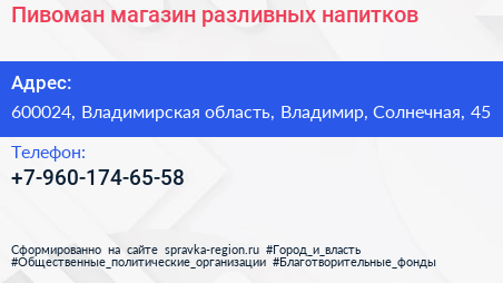 Пивоман, магазин разливных напитков по адресу 600024, Владимирская область, Владимир, Солнечная, 45 в дальнейшем Организация, размещена в следующих категориях: