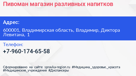Пивоман, магазин разливных напитков по адресу 600001, Владимирская область, Владимир, Диктора Левитана, 1 в дальнейшем Организация, размещена в следующих категориях: