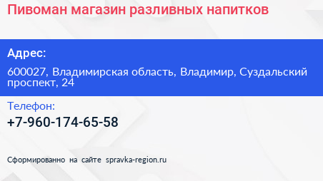 Пивоман, магазин разливных напитков по адресу 600027, Владимирская область, Владимир, Суздальский проспект, 24 в дальнейшем Организация, размещена в следующих категориях: