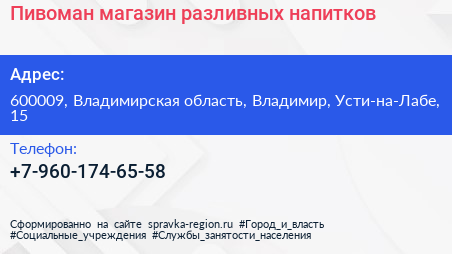Пивоман, магазин разливных напитков по адресу 600009, Владимирская область, Владимир, Усти-на-Лабе, 15 в дальнейшем Организация, размещена в следующих категориях: