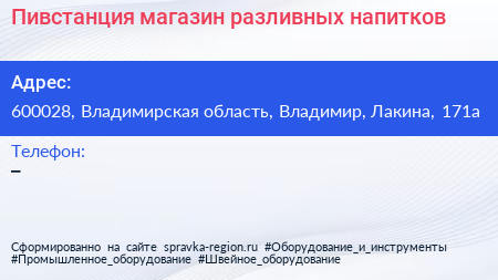 Пивстанция, магазин разливных напитков по адресу 600028, Владимирская область, Владимир, Лакина, 171а в дальнейшем Организация, размещена в следующих категориях: