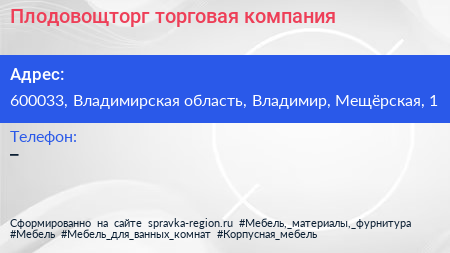 Плодовощторг, торговая компания по адресу 600033, Владимирская область, Владимир, Мещёрская, 1 в дальнейшем Организация, размещена в следующих категориях: