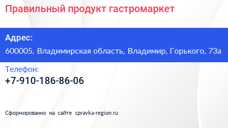 Правильный продукт, гастромаркет по адресу 600005, Владимирская область, Владимир, Горького, 73а в дальнейшем Организация, размещена в следующих категориях:
