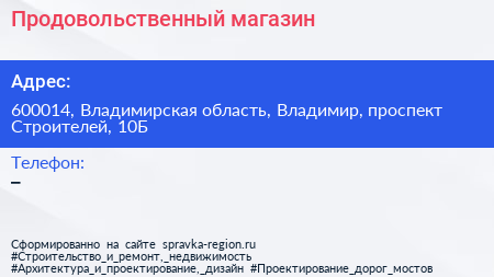 Продовольственный магазин по адресу 600014, Владимирская область, Владимир, проспект Строителей, 10Б в дальнейшем Организация, размещена в следующих категориях: