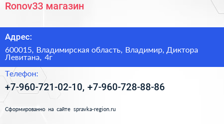 Ronov33, магазин по адресу 600015, Владимирская область, Владимир, Диктора Левитана, 4г в дальнейшем Организация, размещена в следующих категориях: