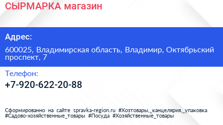 СЫРМАРКА, магазин по адресу 600025, Владимирская область, Владимир, Октябрьский проспект, 7 в дальнейшем Организация, размещена в следующих категориях:
