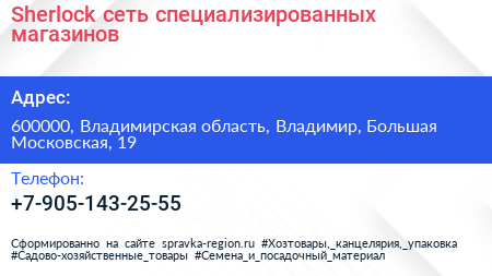 Sherlock, сеть специализированных магазинов по адресу 600000, Владимирская область, Владимир, Большая Московская, 19 в дальнейшем Организация, размещена в следующих категориях: