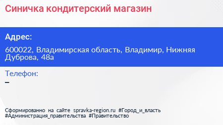Синичка, кондитерский магазин по адресу 600022, Владимирская область, Владимир, Нижняя Дуброва, 48а в дальнейшем Организация, размещена в следующих категориях: