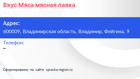 Вкус Мяса, мясная лавка по адресу 600009, Владимирская область, Владимир, Фейгина, 9 в дальнейшем Организация, размещена в следующих категориях: