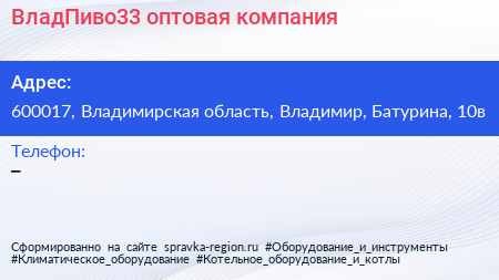ВладПиво33, оптовая компания по адресу 600017, Владимирская область, Владимир, Батурина, 10в в дальнейшем Организация, размещена в следующих категориях: