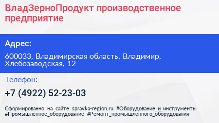 ВладЗерноПродукт, производственное предприятие по адресу 600033, Владимирская область, Владимир, Хлебозаводская, 12 в дальнейшем Организация, размещена в следующих категориях: