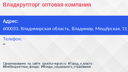 Владкрупторг, оптовая компания по адресу 600033, Владимирская область, Владимир, Мещёрская, 11 в дальнейшем Организация, размещена в следующих категориях: