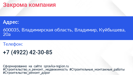 Закрома, компания по адресу 600035, Владимирская область, Владимир, Куйбышева, 20а в дальнейшем Организация, размещена в следующих категориях: