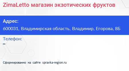 ZimaLetto, магазин экзотических фруктов по адресу 600031, Владимирская область, Владимир, Егорова, 8Б в дальнейшем Организация, размещена в следующих категориях: