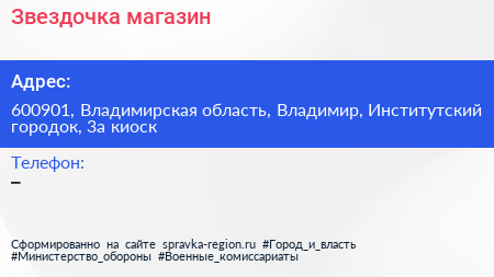 Звездочка, магазин по адресу 600901, Владимирская область, Владимир, Институтский городок, 3а киоск в дальнейшем Организация, размещена в следующих категориях: