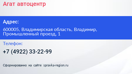 Агат, автоцентр по адресу 600005, Владимирская область, Владимир, Промышленный проезд, 1 в дальнейшем Организация, размещена в следующих категориях: