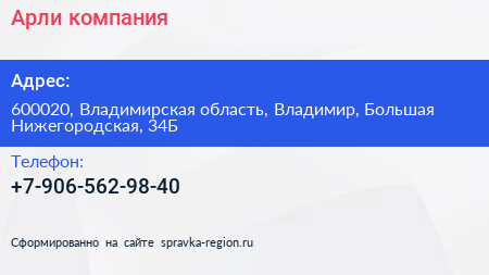 Арли, компания по адресу 600020, Владимирская область, Владимир, Большая Нижегородская, 34Б в дальнейшем Организация, размещена в следующих категориях: