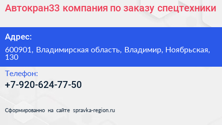 Автокран33, компания по заказу спецтехники по адресу 600901, Владимирская область, Владимир, Ноябрьская, 130 в дальнейшем Организация, размещена в следующих категориях:
