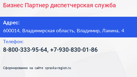 Бизнес Партнер, диспетчерская служба по адресу 600014, Владимирская область, Владимир, Лакина, 4 в дальнейшем Организация, размещена в следующих категориях: