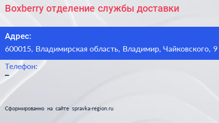 Boxberry, отделение службы доставки по адресу 600015, Владимирская область, Владимир, Чайковского, 9 в дальнейшем Организация, размещена в следующих категориях: