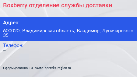 Boxberry, отделение службы доставки по адресу 600020, Владимирская область, Владимир, Луначарского, 35 в дальнейшем Организация, размещена в следующих категориях: