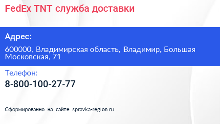 FedEx-TNT, служба доставки по адресу 600000, Владимирская область, Владимир, Большая Московская, 71 в дальнейшем Организация, размещена в следующих категориях:
