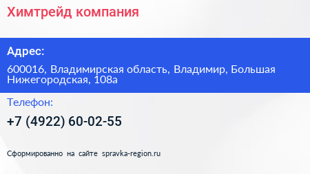 Химтрейд, компания по адресу 600016, Владимирская область, Владимир, Большая Нижегородская, 108а в дальнейшем Организация, размещена в следующих категориях: