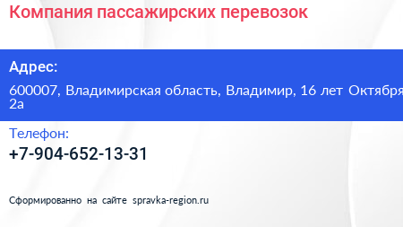 Компания пассажирских перевозок по адресу 600007, Владимирская область, Владимир, 16 лет Октября, 2а в дальнейшем Организация, размещена в следующих категориях: