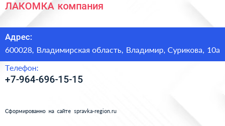 ЛАКОМКА, компания по адресу 600028, Владимирская область, Владимир, Сурикова, 10а в дальнейшем Организация, размещена в следующих категориях: