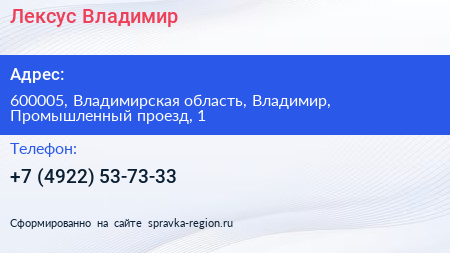 Лексус Владимир по адресу 600005, Владимирская область, Владимир, Промышленный проезд, 1 в дальнейшем Организация, размещена в следующих категориях:
