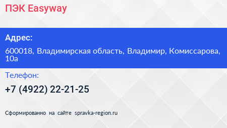ПЭК: Easyway по адресу 600018, Владимирская область, Владимир, Комиссарова, 10а в дальнейшем Организация, размещена в следующих категориях: