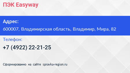 ПЭК: Easyway по адресу 600007, Владимирская область, Владимир, Мира, 82 в дальнейшем Организация, размещена в следующих категориях: