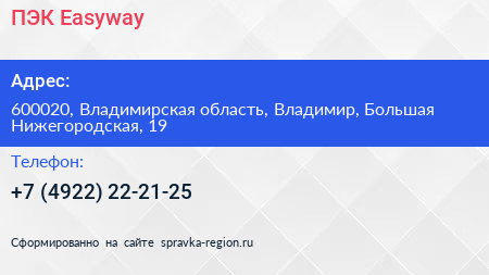ПЭК: Easyway по адресу 600020, Владимирская область, Владимир, Большая Нижегородская, 19 в дальнейшем Организация, размещена в следующих категориях: