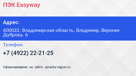 ПЭК: Easyway по адресу 600022, Владимирская область, Владимир, Верхняя Дуброва, 6 в дальнейшем Организация, размещена в следующих категориях: