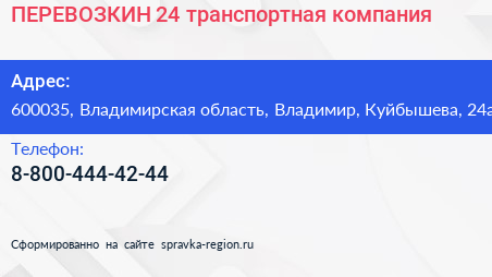 ПЕРЕВОЗКИН 24, транспортная компания по адресу 600035, Владимирская область, Владимир, Куйбышева, 24а в дальнейшем Организация, размещена в следующих категориях: