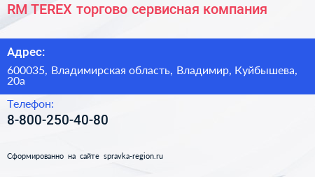 RM TEREX, торгово-сервисная компания по адресу 600035, Владимирская область, Владимир, Куйбышева, 20а в дальнейшем Организация, размещена в следующих категориях: