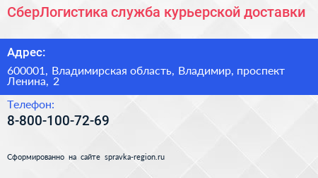 СберЛогистика, служба курьерской доставки по адресу 600001, Владимирская область, Владимир, проспект Ленина, 2 в дальнейшем Организация, размещена в следующих категориях: