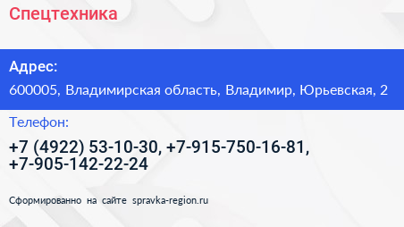Спецтехника+ по адресу 600005, Владимирская область, Владимир, Юрьевская, 2 в дальнейшем Организация, размещена в следующих категориях: