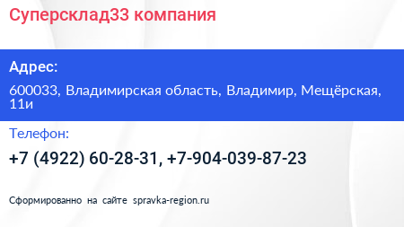 Суперсклад33, компания по адресу 600033, Владимирская область, Владимир, Мещёрская, 11и в дальнейшем Организация, размещена в следующих категориях: