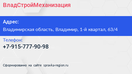 ВладСтройМеханизация по адресу Владимирская область, Владимир, 1-й квартал, 63/4 в дальнейшем Организация, размещена в следующих категориях: