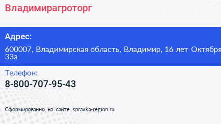 Владимирагроторг по адресу 600007, Владимирская область, Владимир, 16 лет Октября, 33а в дальнейшем Организация, размещена в следующих категориях: