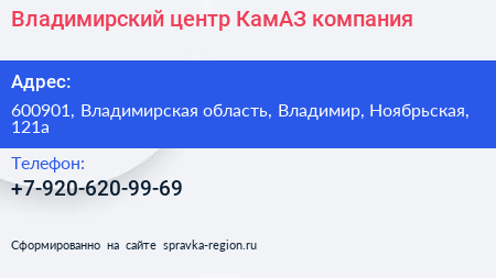 Владимирский центр КамАЗ, компания по адресу 600901, Владимирская область, Владимир, Ноябрьская, 121а в дальнейшем Организация, размещена в следующих категориях: