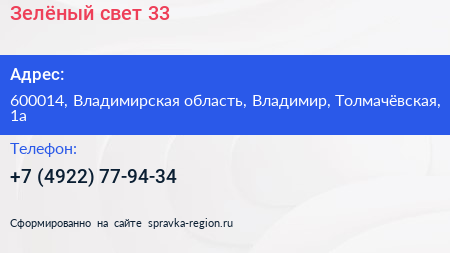 Зелёный свет-33 по адресу 600014, Владимирская область, Владимир, Толмачёвская, 1а в дальнейшем Организация, размещена в следующих категориях: